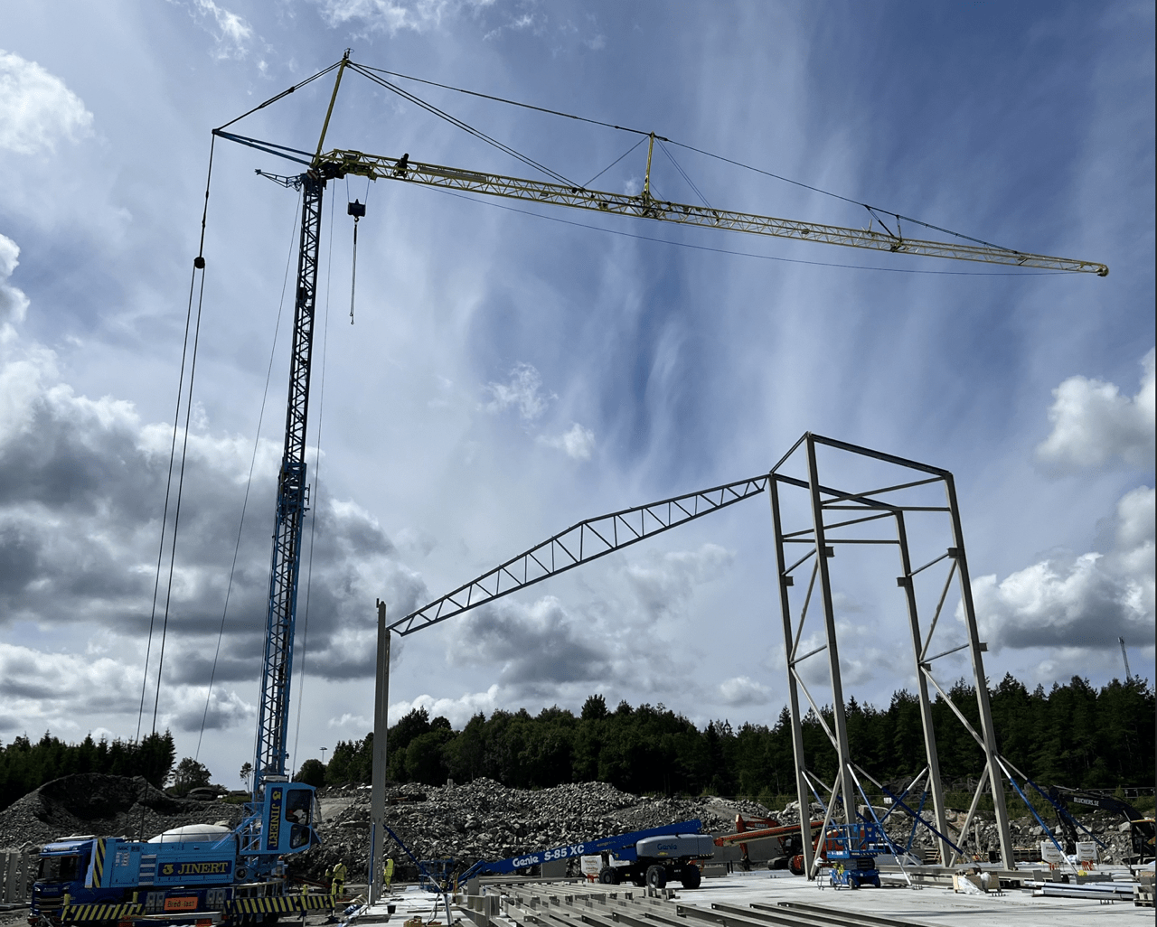 Se bilder från när första takstolen läggs på plats nedan.